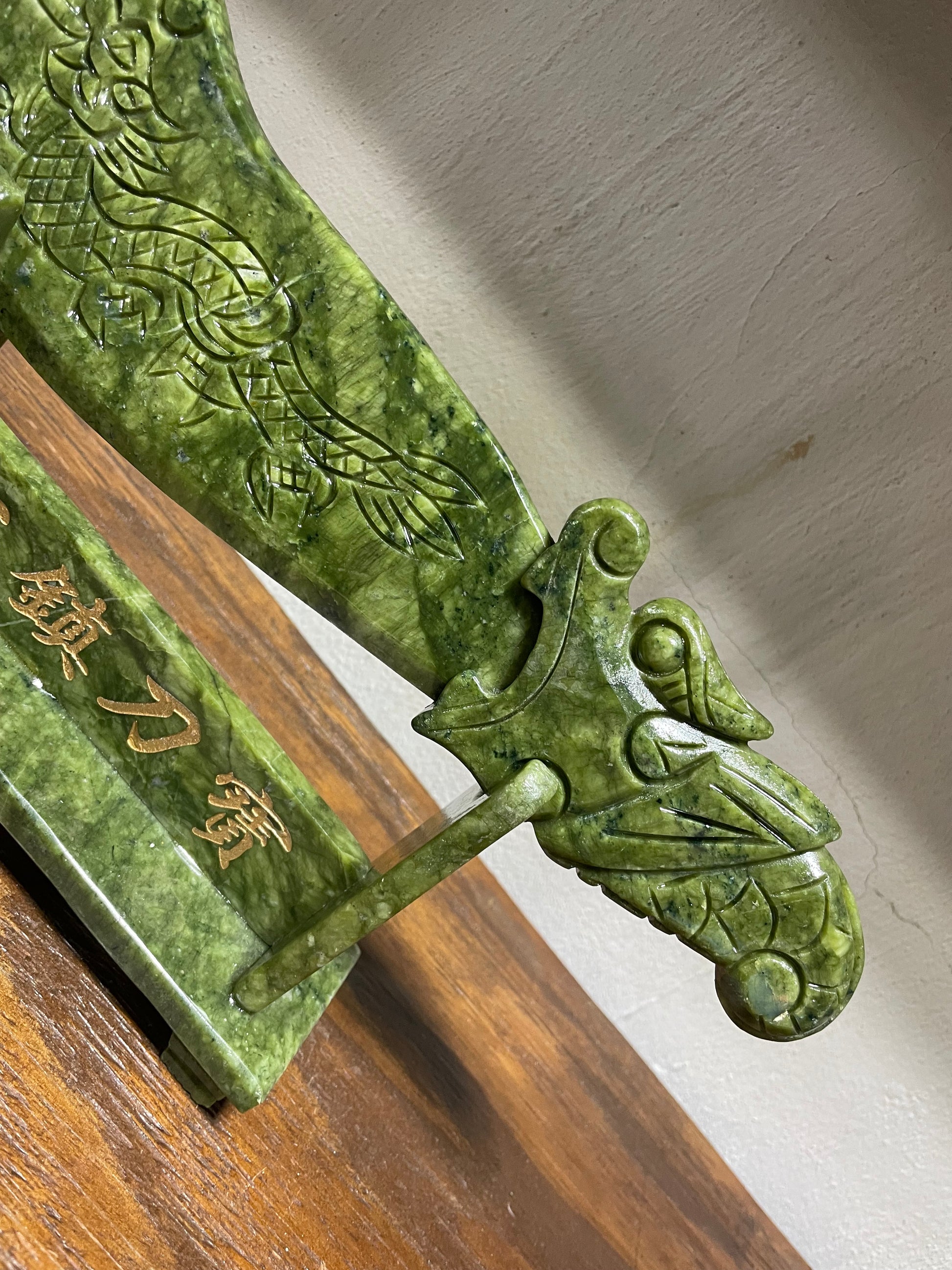 Large Serpentine Jade Sword on stand. Handmade and carved. 14 in.